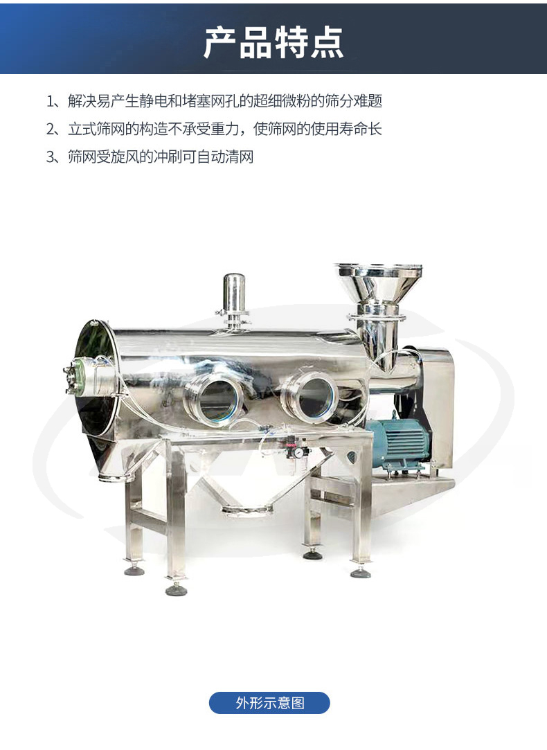 4、篩網(wǎng)受旋風(fēng)的沖刷,可自動清網(wǎng)。