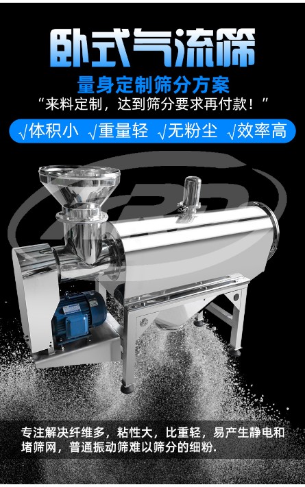 氣流篩由于形狀為橫臥狀所以也叫臥式氣流篩或臥式氣旋篩。臥式氣流篩主要適用于各種淀粉、木糖醇、靈芝粉、麥芽粉、咖啡粉、調(diào)味品、食品添加劑、中藥粉、珍珠巖、硅微粉、活性炭、聚乙烯粉、滅火劑、顏料、花粉、蔬菜粉、蛋粉、奶粉、蘇打粉、香精等各種粉末類物料。