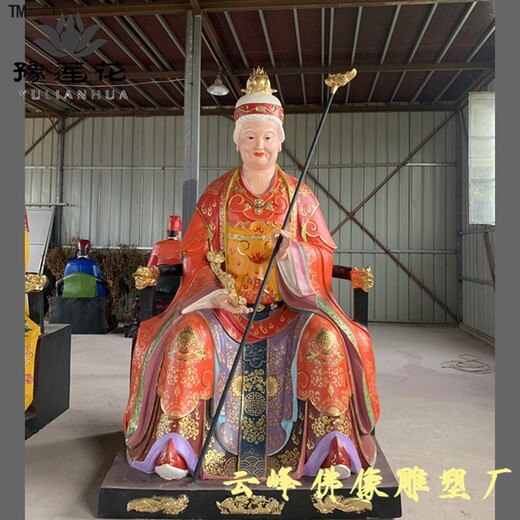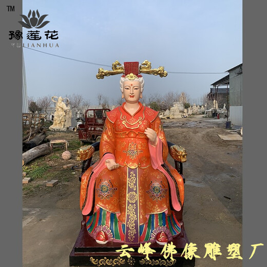 地藏老母:坐一把金黃色鳳椅,身穿印有黑鳳凰圖像的紅色服裝。手中拿一法寶叫《金屋》。