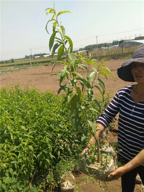 蜜4號桃樹苗:9月上中旬成熟,果肉金黃,口感純甜,果面全紅,套袋里外金,黏核,單果重350克左右,可溶性固形物17%-21%,品質(zhì)極上,自花結(jié)實,極豐產(chǎn),成熟后掛樹月余不軟。以其個大,汁多,色澤好省內(nèi)外。2000年被山東省林業(yè)廳、山東省經(jīng)濟林協(xié)會命名為“桃之鄉(xiāng)”。桃栽培面積達1340公頃,年產(chǎn)量為3萬多噸。