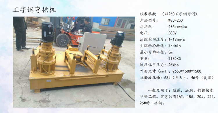 WGJ-250型液壓工字鋼冷彎機廣泛應(yīng)用于我國公路地道、鐵路地道、地鐵地道、水利水電引水涵洞、天然氣管道、通訊管道、地下通道等工程的工字鋼、槽鋼和型鋼工程中的折彎施工。工字鋼冷彎機