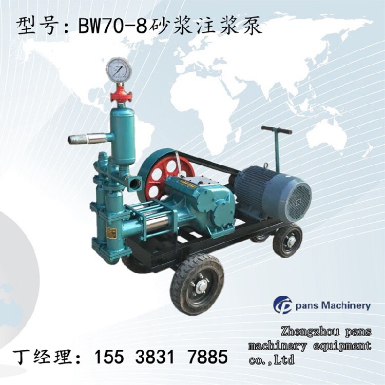 BW70-8雙缸砂漿泵采用4槽B型三角帶傳動,具有傳動平穩(wěn),過載保護打滑等優(yōu)點。驅動電機選用的是Y160M-4三相異步電動機,功率為11KW,傳遞扭矩大,、損耗少。