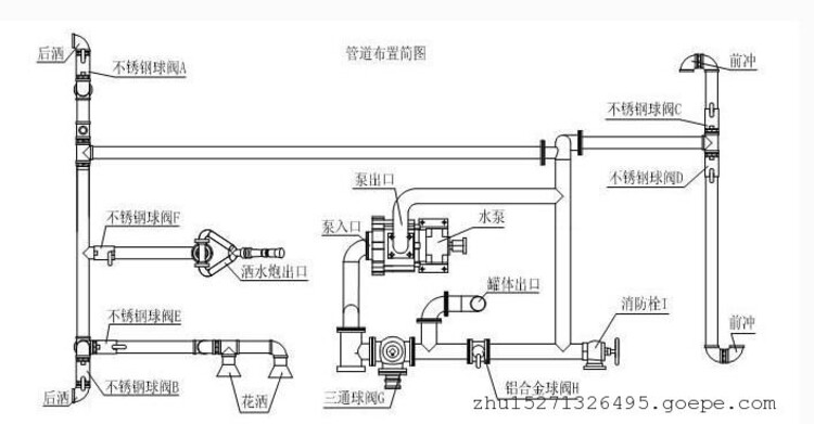 3、高噴射:配備高射槍一支,射程可達30m以上,根據(jù)需要可調(diào)節(jié)成霧狀或柱狀,主要用于園林綠化,緊急情況下可用于消防。