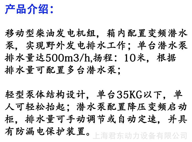 上海君東動(dòng)力設(shè)備有限公司主營(yíng):輕型潛水泵,發(fā)電排水兩用泵車,500立方潛水泵,500方移動(dòng)泵車,提供大流量發(fā)電排水照明單元應(yīng)急搶險(xiǎn)500立方輕型潛水泵兩用泵車,公司一直堅(jiān)持以人為本、誠(chéng)信立業(yè)的理念,為客戶提供優(yōu)質(zhì)的大流量發(fā)電排水照明單元應(yīng)急搶險(xiǎn)500立方輕型潛水泵兩用泵車服務(wù),由于產(chǎn)品規(guī)格不同,價(jià)格也有所不同,如有需求請(qǐng)與我電話溝通,以免給您造成不必要的損失。