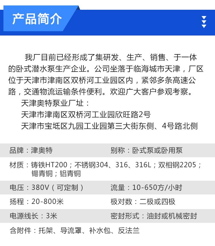 臥式潛水泵是潛水泵的一種,深井提水的重要設(shè)備。使用時整個機組潛入水中工作。把地下水提取到地表,是生活用水、礦山搶險、工業(yè)冷卻、農(nóng)田灌溉、海水提升、輪船調(diào)載,還可用于噴泉景觀,熱水潛水泵用于溫泉洗浴,還可適用于從深井中提取地下水,也可用于河流、水庫、水渠等提水工程。主要用于農(nóng)田灌溉及高山區(qū)人畜用水,亦可供中央空調(diào)冷卻、熱泵機組、冷泵機組、城市、工廠、鐵路、礦山、工地排水使用。 一般流量可以達到(10m3~650m3)每小時、揚程可達到1500米。