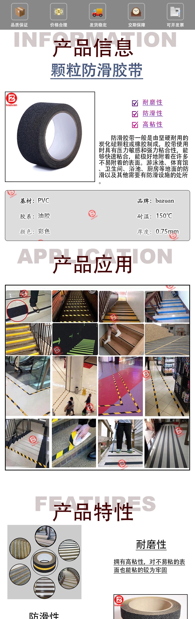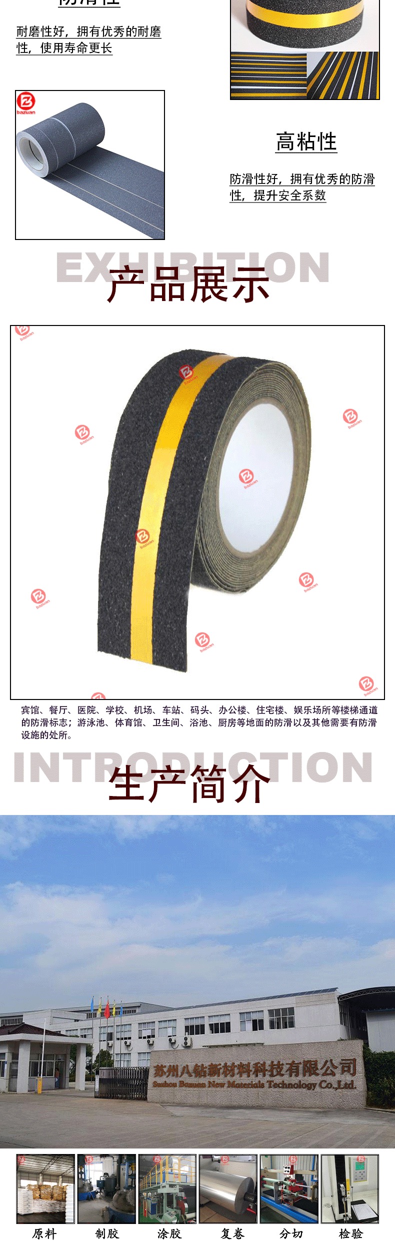 簡 述:防滑膠帶一般是由堅(jiān)硬耐用的炭化硅顆粒或橡膠制成,膠帶使用時(shí)具有壓力敏感和強(qiáng)力粘合性,能夠快速粘合,能地附著在許多不易附著的表面。游泳池、體育館、衛(wèi)生間、浴池、廚房等地面的防滑以及其他需要有防滑設(shè)施的處所。